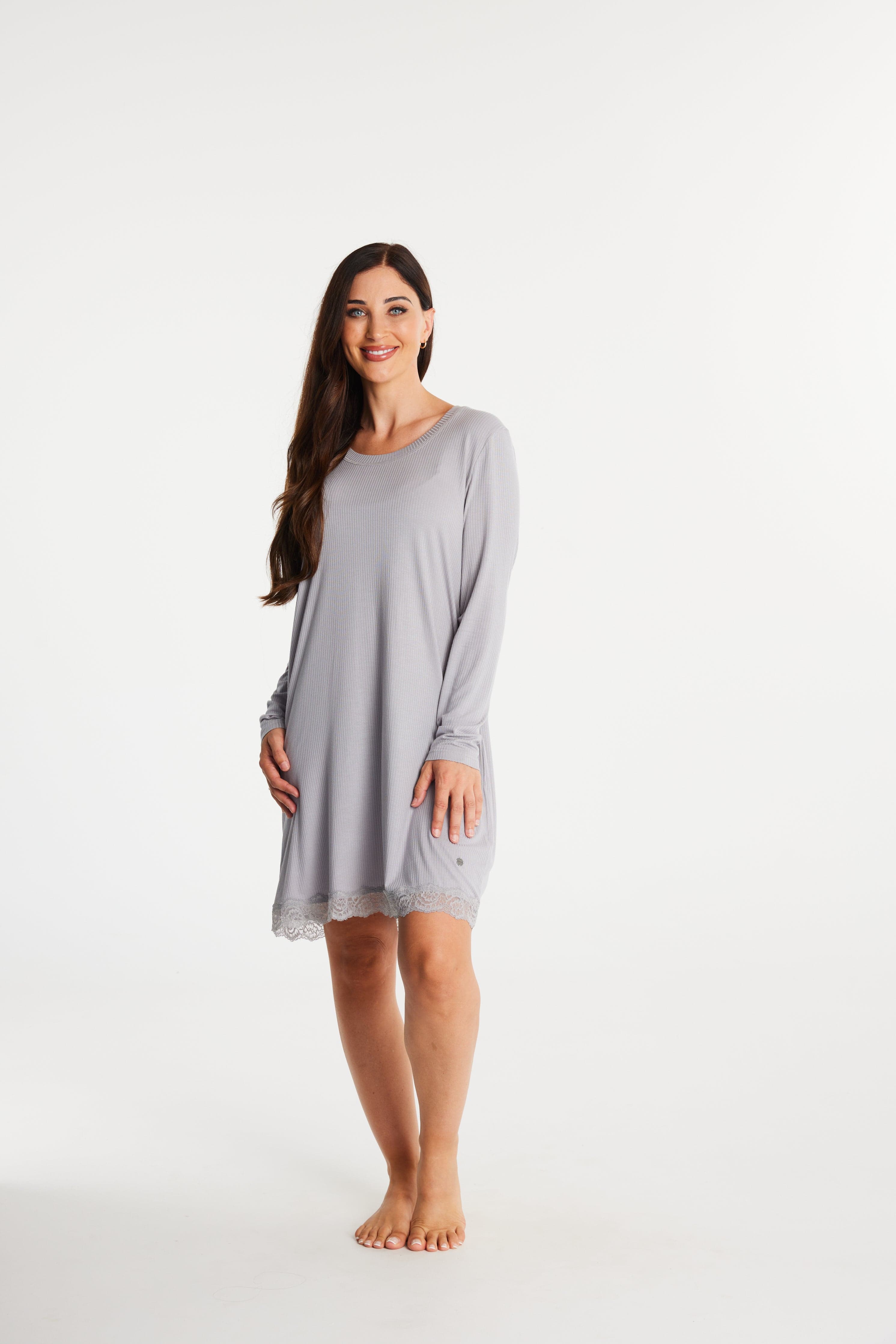 Slip into comfort with the Darling Dreams Nightie, designed for nights of pure relaxation! Made from soft and stretchy 4x2 grey marle rib fabric, this long-sleeve nightie features a relaxed fit and a delicate lace-trimmed hem. Perfect for cosy evenings or leisurely mornings, it's simply a must-have!