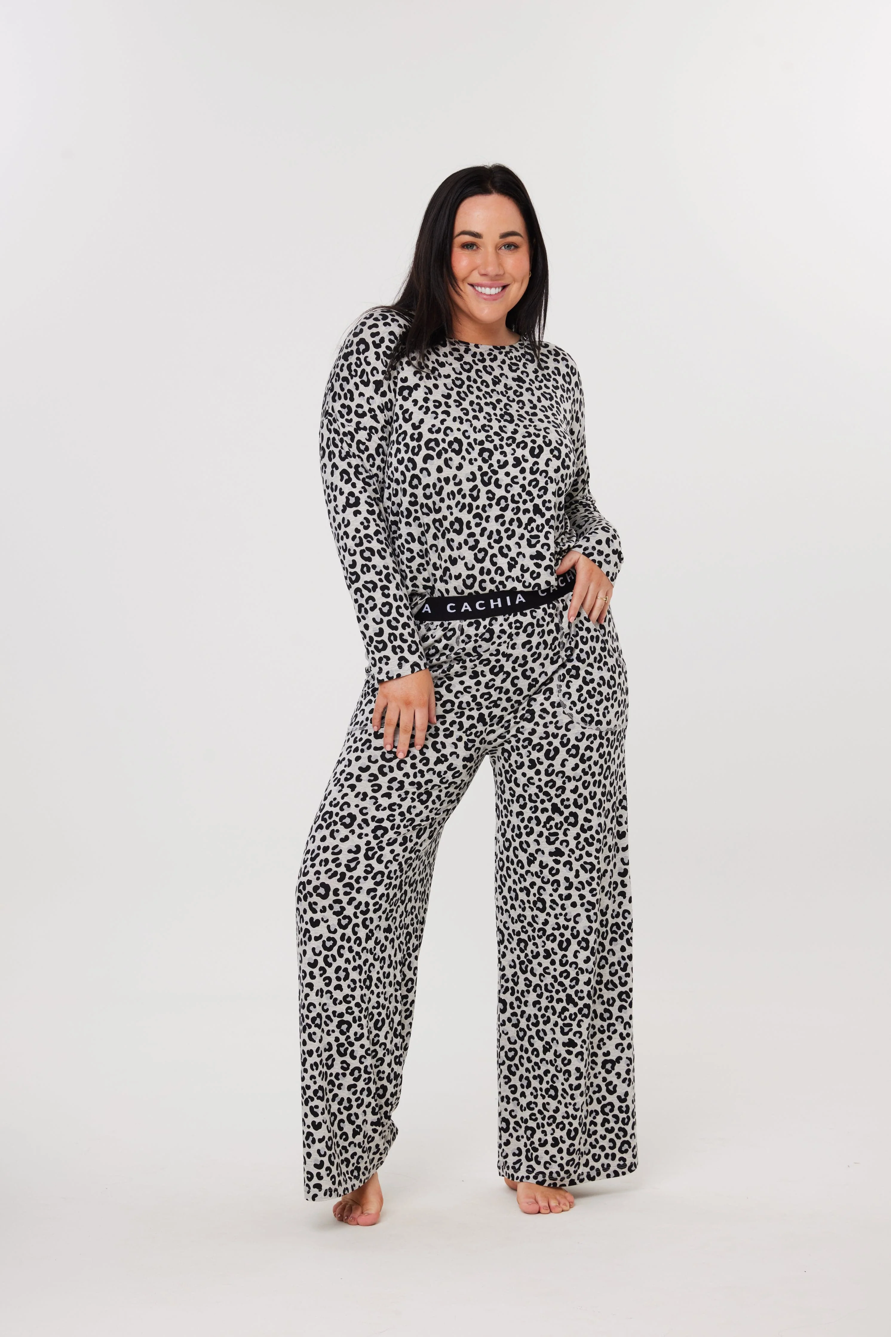 A fresh twist on a fan favourite, meet the Steel Harrie Set! Crafted from the same buttery-soft fabric you know and love, this set features a bold grey and black leopard print on a grey marle base for a sleek, elevated vibe.The wide leg pant offers a relaxed silhouette, paired with our signature elastic waistband for all-day comfort. Whether you're lounging, working from home, or going for a walk, Steel Harrie brings comfort and confidence in one effortlessly cool look.